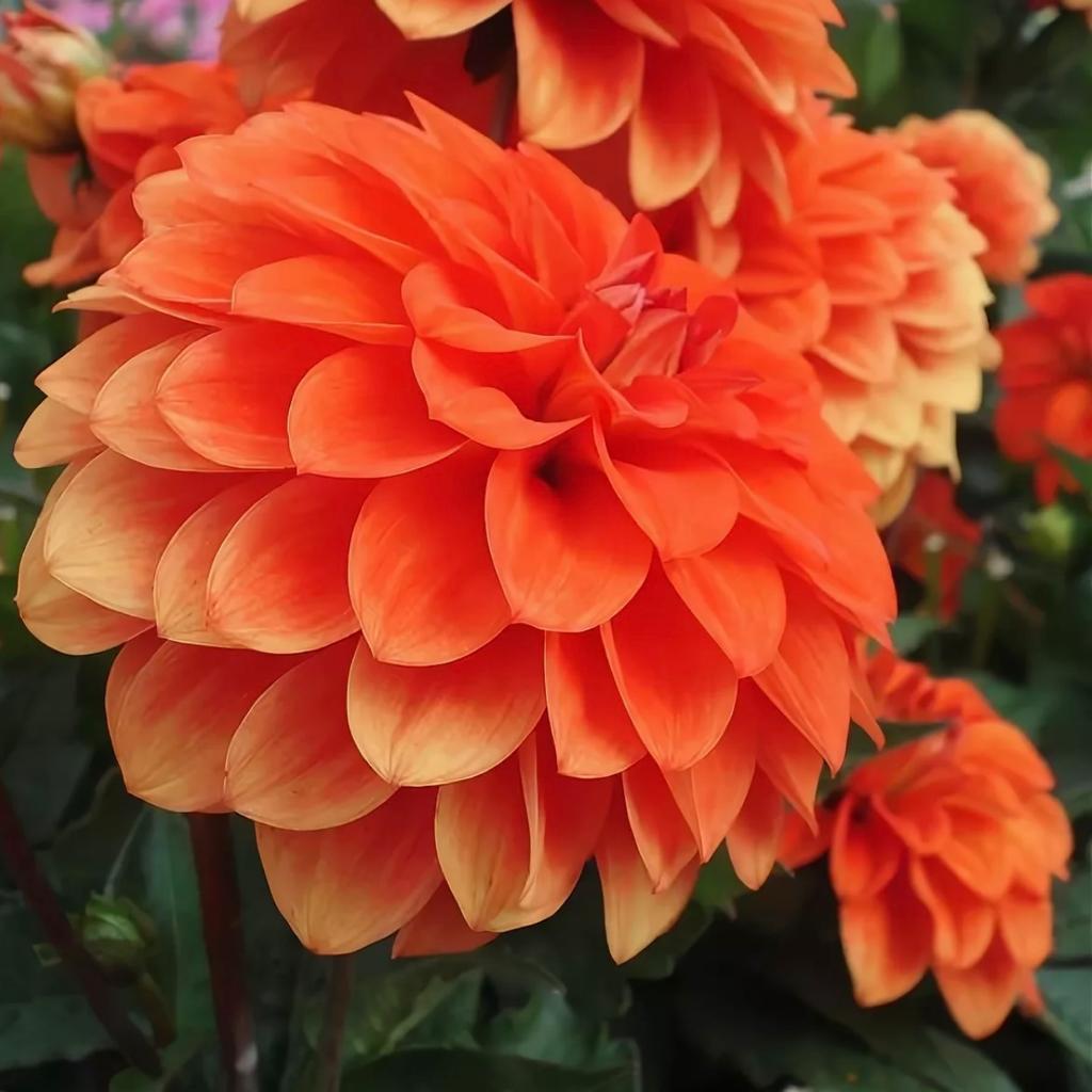 Цветут ярко-красными цветками, в свете чего выделяются востребованностью среди флористов и садоводов. Соцветия довольно крупные, в композиции с другими цветками будут выглядеть очень достойно. Растения высотой 50-60 см, обильно ветвятся, формируя пышные кусты с обилием цветоносов. Корзинки немахровые и полумахровые, окраска язычковых цветков самая разнообразная, ярких и пастельных тонов, контрастная и меланжевая. Полностью махровый цветок, диаметром от 10 до 25 см, имеет плоские лепестки (язычковые цветки), слегка закрученные и отогнутые к стеблю, что делает его необыкновенно пышным и эффектным. Окраска самая разнообразная.